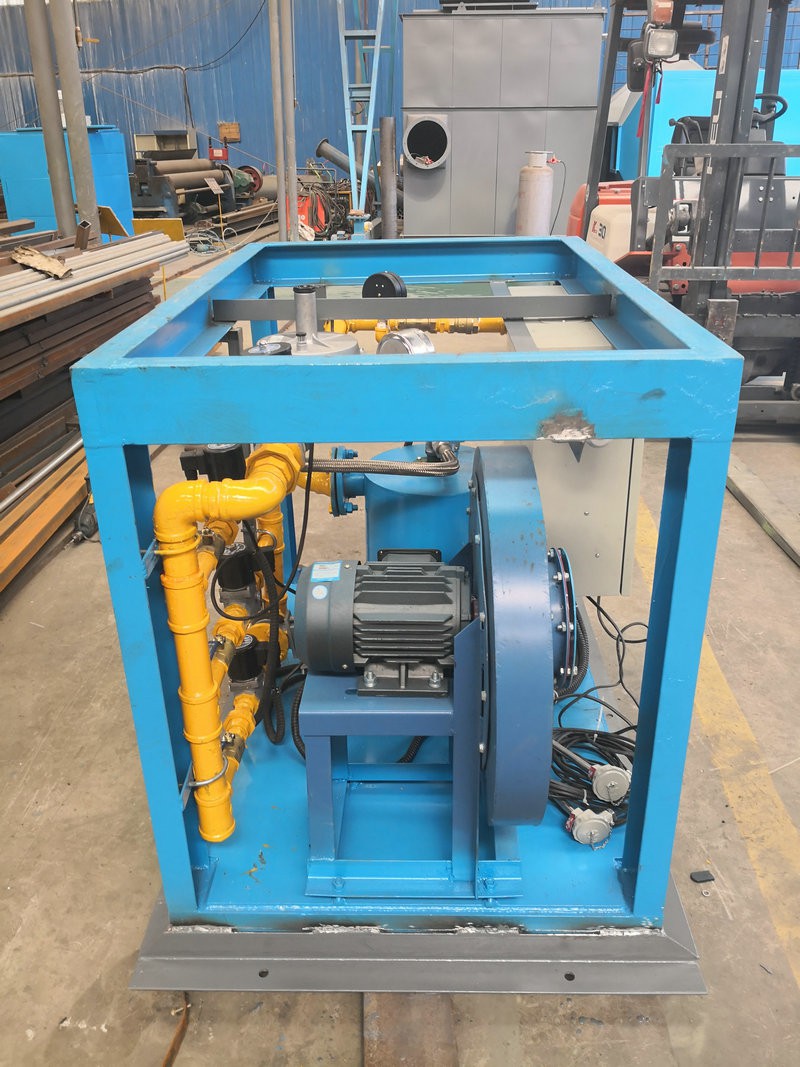中間包烘烤器:包括燃燒器、鼓風機、助燃風管道系統和煤氣管道系統,所述助燃風管道系統一端連接鼓風機,另一端接入位于燃燒器前的煤氣管道系統,還包括通過控制煤氣管道閥門開閉自動調節溫度的控制系統,所述燃燒器為1-5個(根據膜胎尺寸確定),中間包工作層受熱均勻,易脫模節能效果明顯。